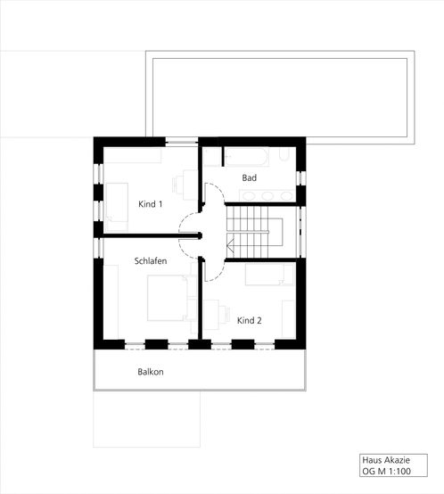 Der Haustyp Akazie präsentiert sich von außen als klassischer Villentypus mit großem Dachüberstand und langgestreckten Fensterformaten. Innen zeichnet er sich durch viel Raum auf kompakter Fläche aus. Ein offener Grundriss minimiert die Verkehrsflächen und schafft großzügige Raumsituationen. Die Ergänzung durch Terrasse und Balkon rundet den Baukörper reizvoll ab. Im Obergeschoss ist bei durchgehend voller Raumhöhe Platz für Eltern, das Bad sowie zwei Kinderzimmer.